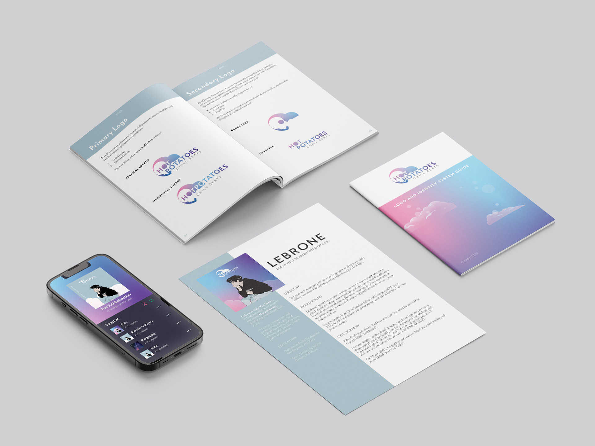 The logo can be playfully transformed into a vinyl player which will be playing all the musics from Hotpotatoes. It can be used as a social media post to play a newly released music, or to feature a collection of music.