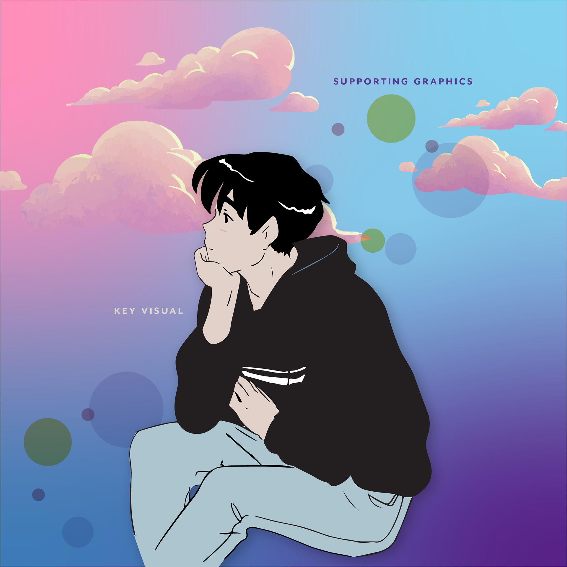 I had the idea of an anime boy creating music amongst clouds. Hence, I explored drawing and combining anime boy figures, clouds, piano, and vinyl.
